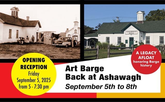 Save the date for our annual “Back at Ashawagh” exhibition, running September 5 to 8 at Ashawagh Hall, Springs. The opening reception will be Friday, September 5, from 5:00 - 7:30 PM. This years show will feature artwork by Friends of The Art Barge, Trustees, instructors, and staff, as well as pieces from our 2025 Childrens Program.